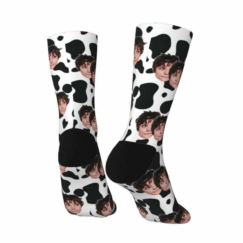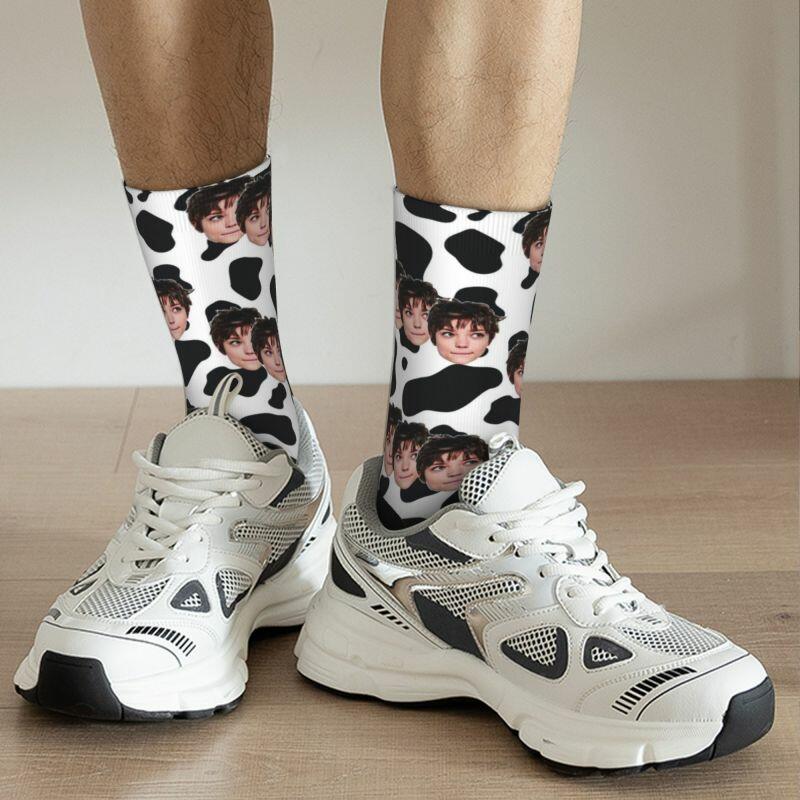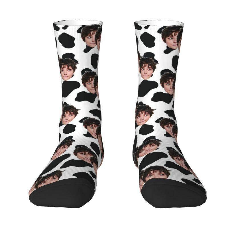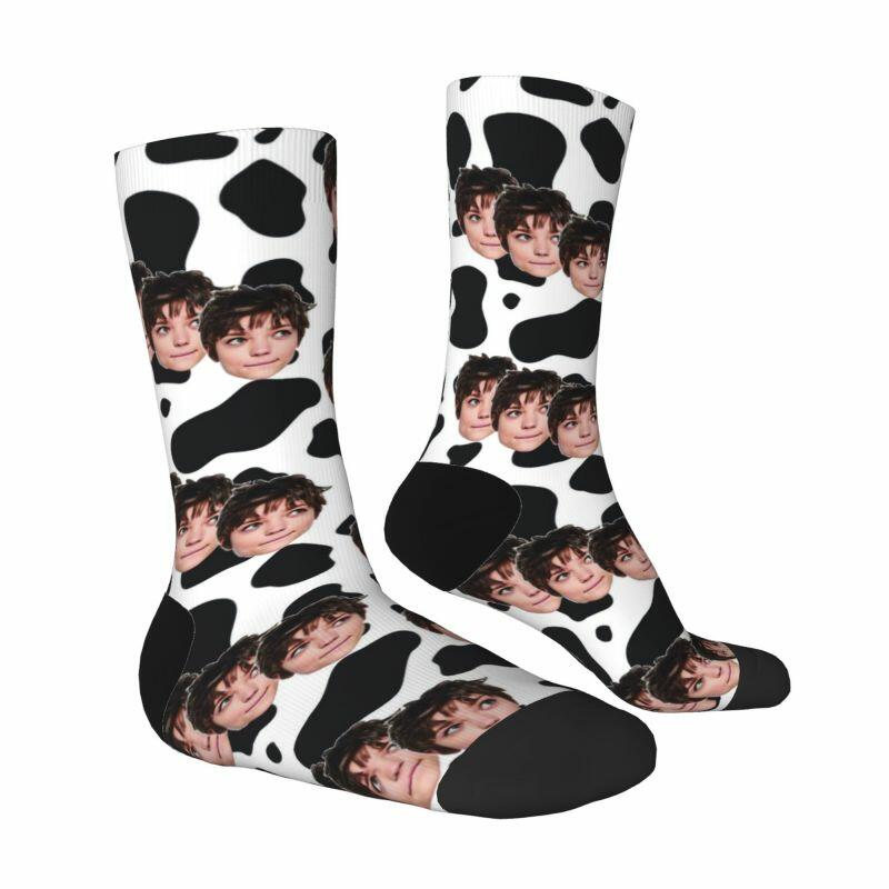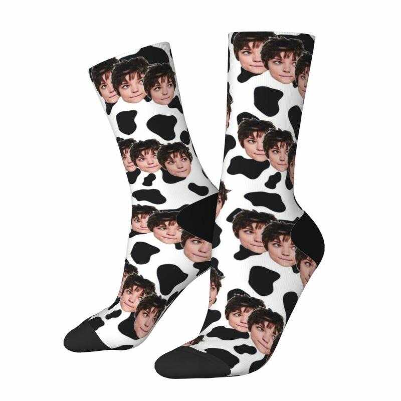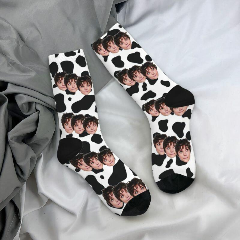Chaussettes personnalisées avec motifs de vaches et photos de trois visages