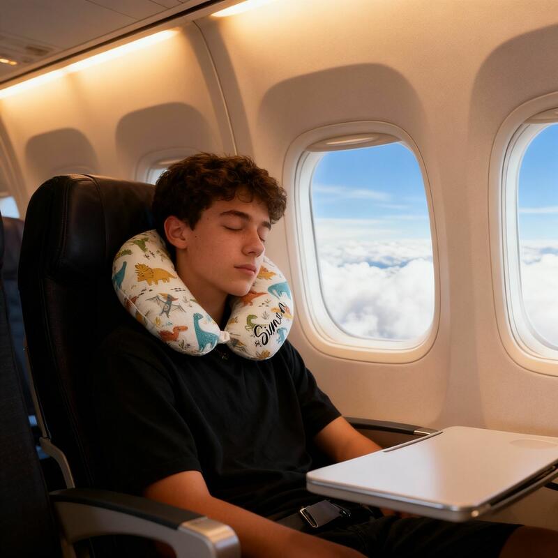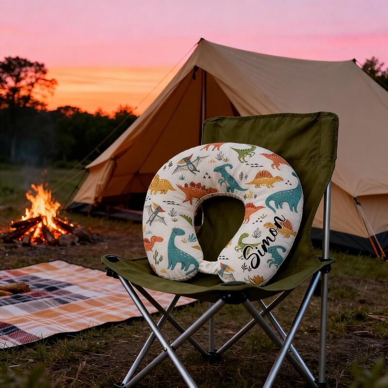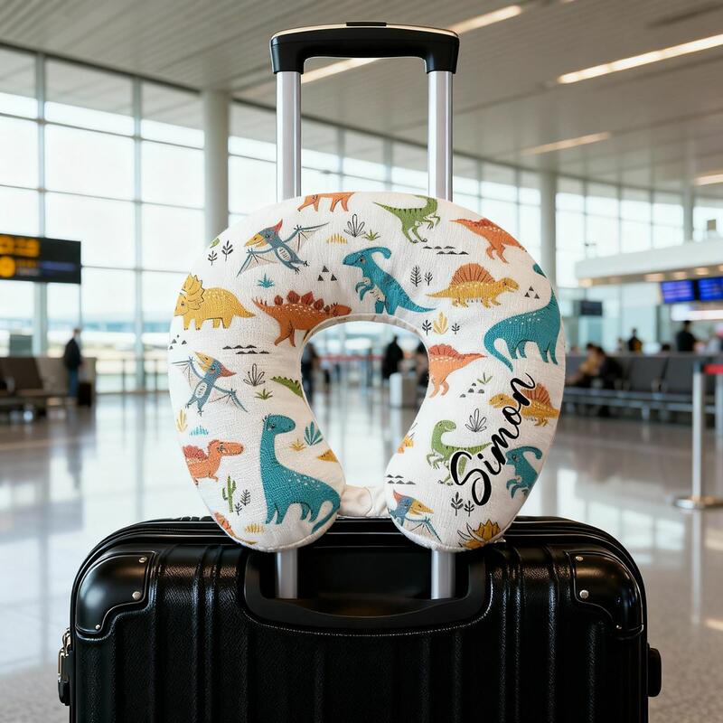 Oreiller en forme de U personnalisé avec nom imprimé dinosaure cartoon indispensable pour les vacances des enfants