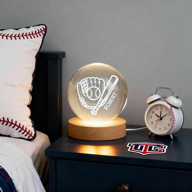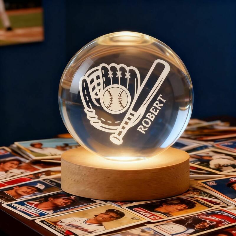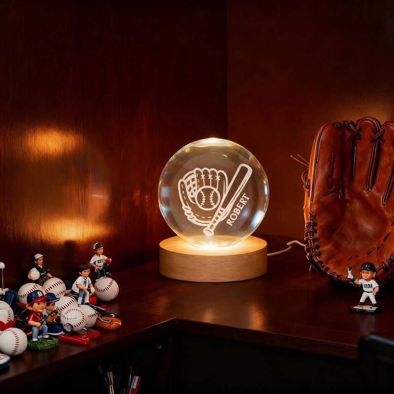 Lampe boule de cristal personnalisée avec motif gant de baseball Gravée avec nom pour les amateurs de sport