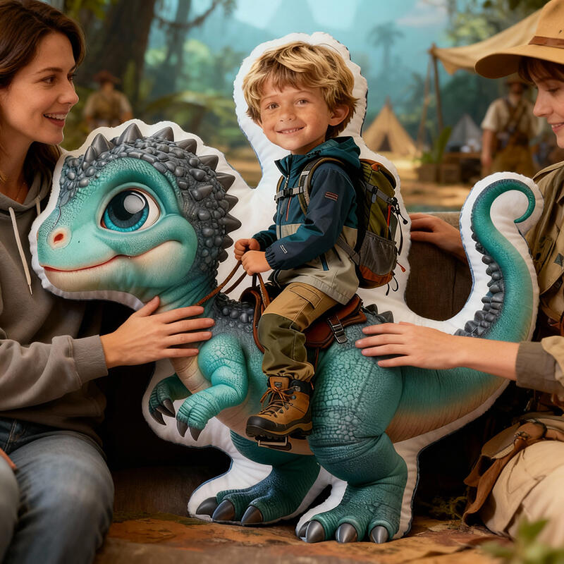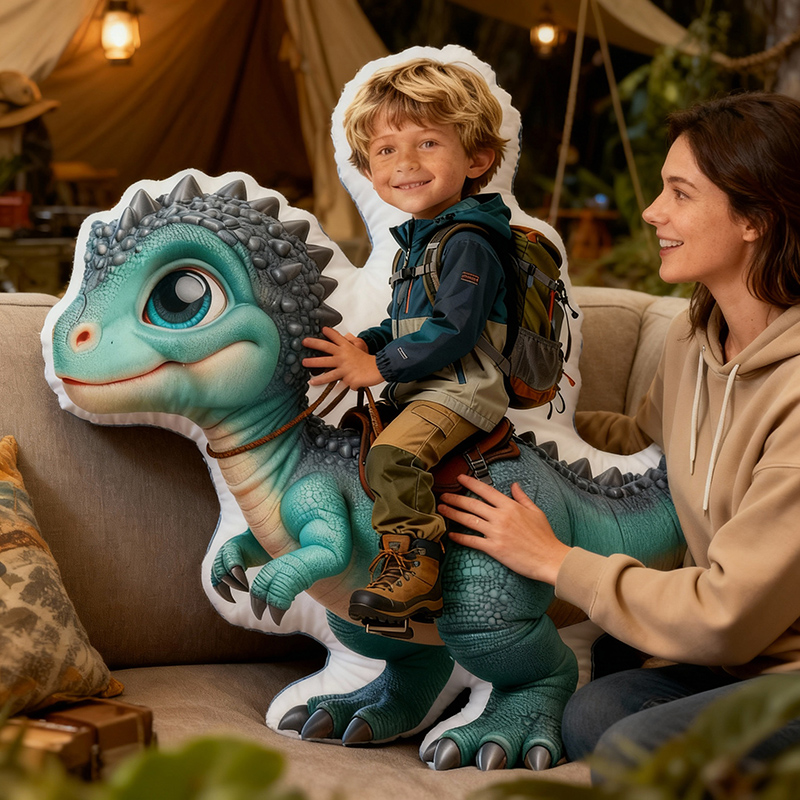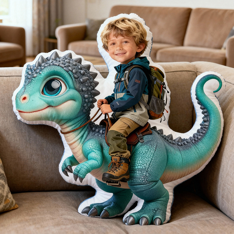 Personalized Face Portrait Pillow with Blue Dinosaur Pattern Creative Gift for Son