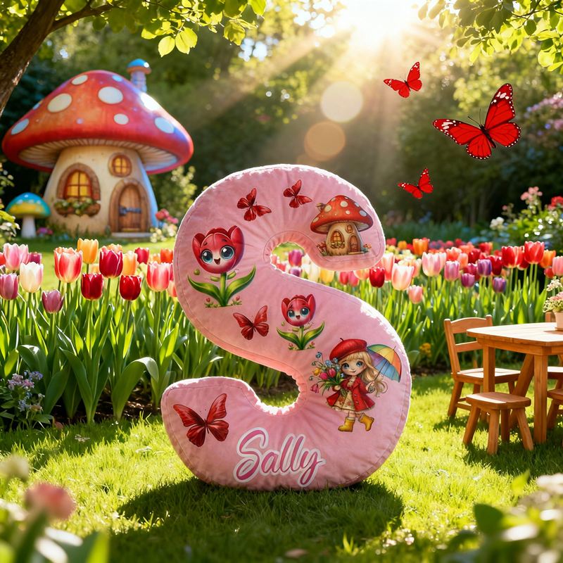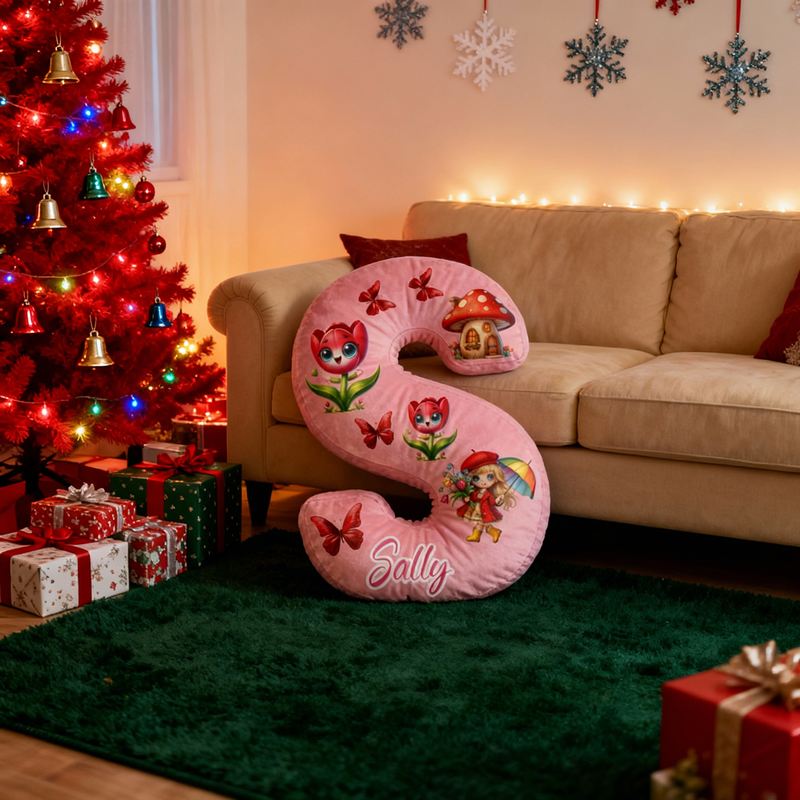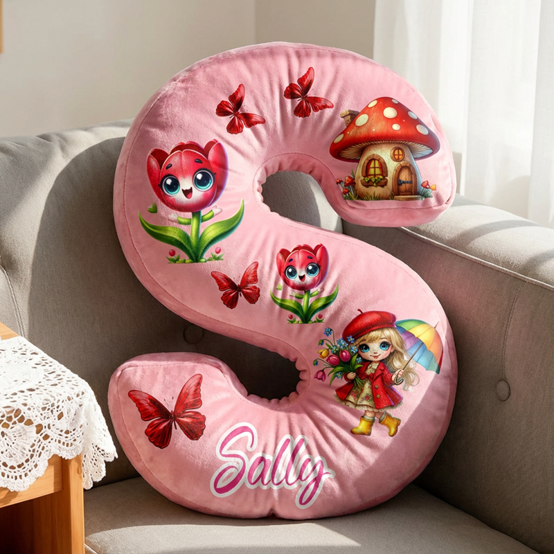 Coussin personnalisé en forme de lettre avec motif papillon champignon et maison rouge cadeau pour filles