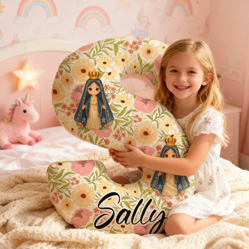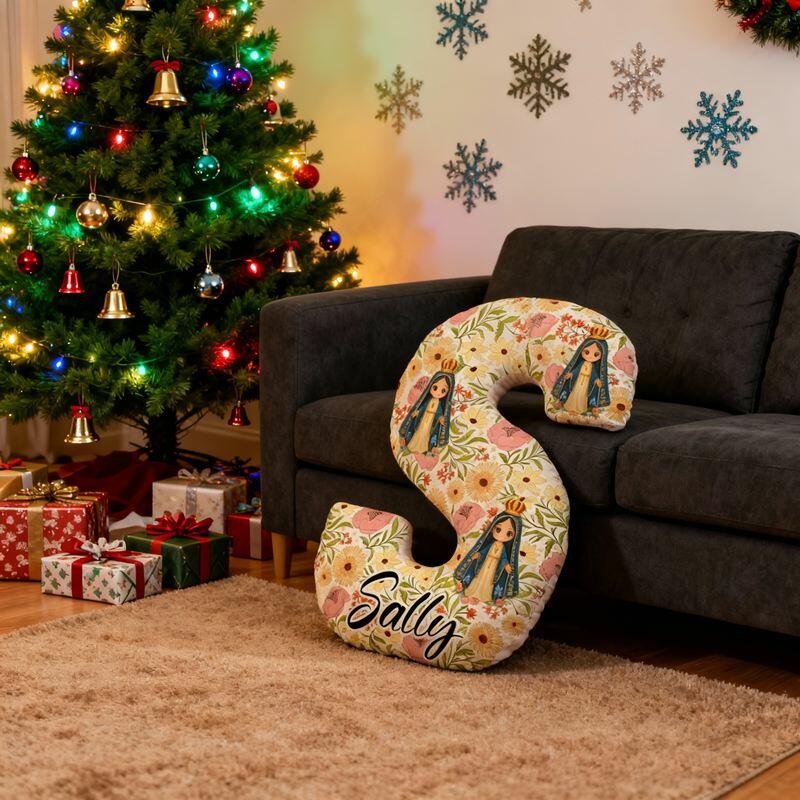 Coussin personnalisé en forme de lettre avec motif élégant de la Vierge Marie et fleurs pour enfant