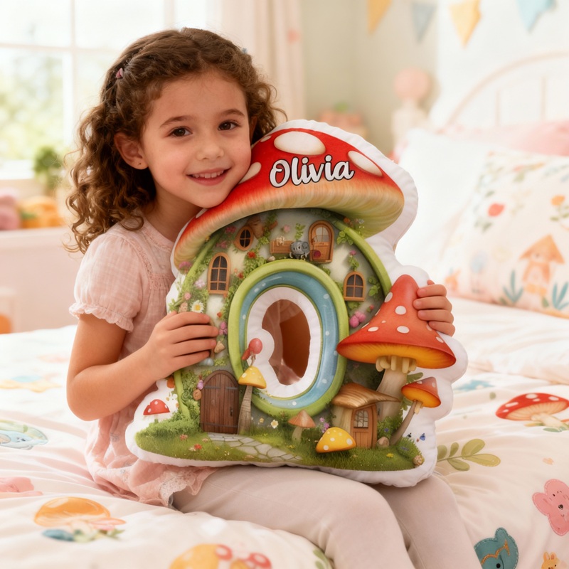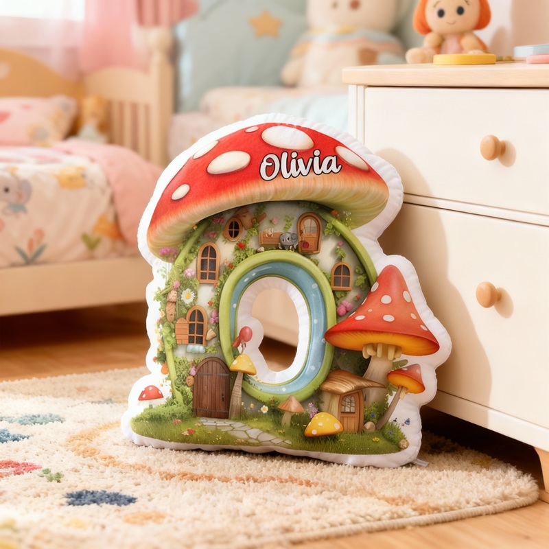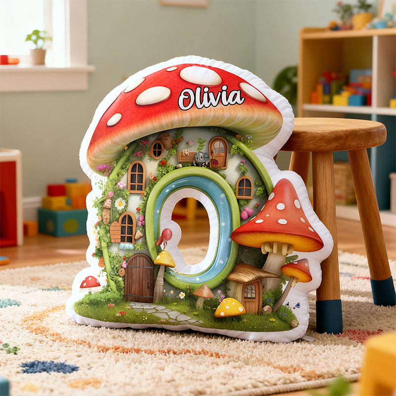 Coussin personnalisé en forme de lettre motif maison champignon de conte de fées cadeau idéal pour enfant