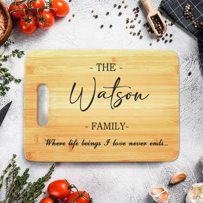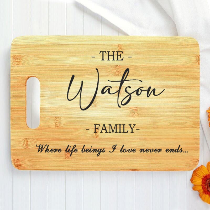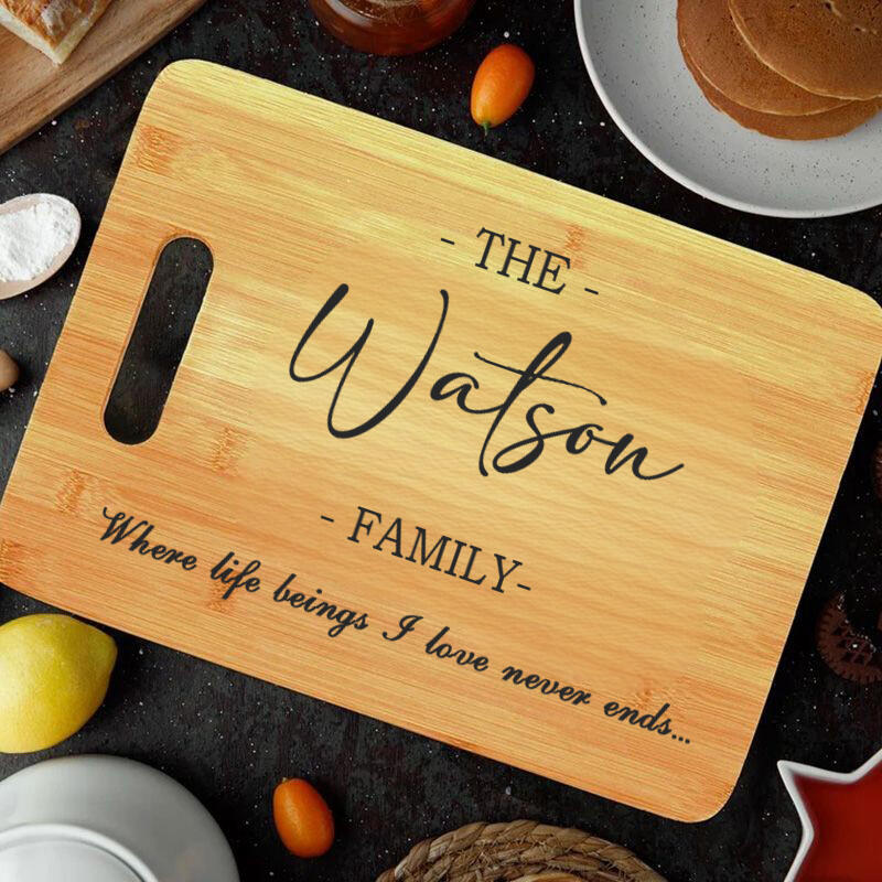 Planche de charcuterie carrée personnalisée Cadeau parfait pour la famille "L'amour ne s'arrête jamais"