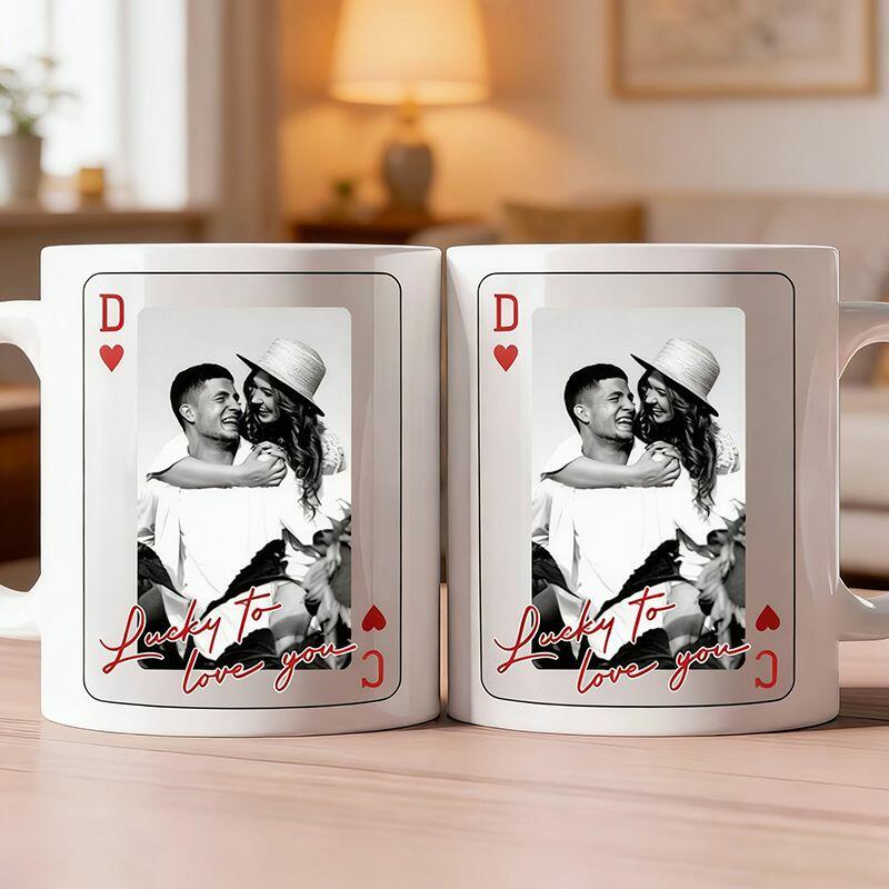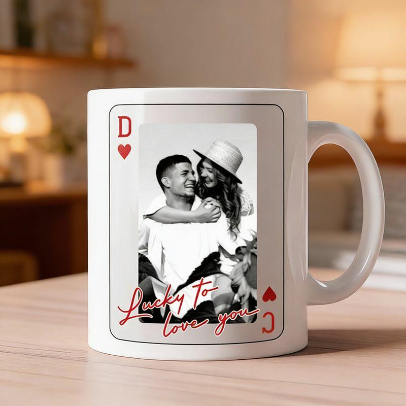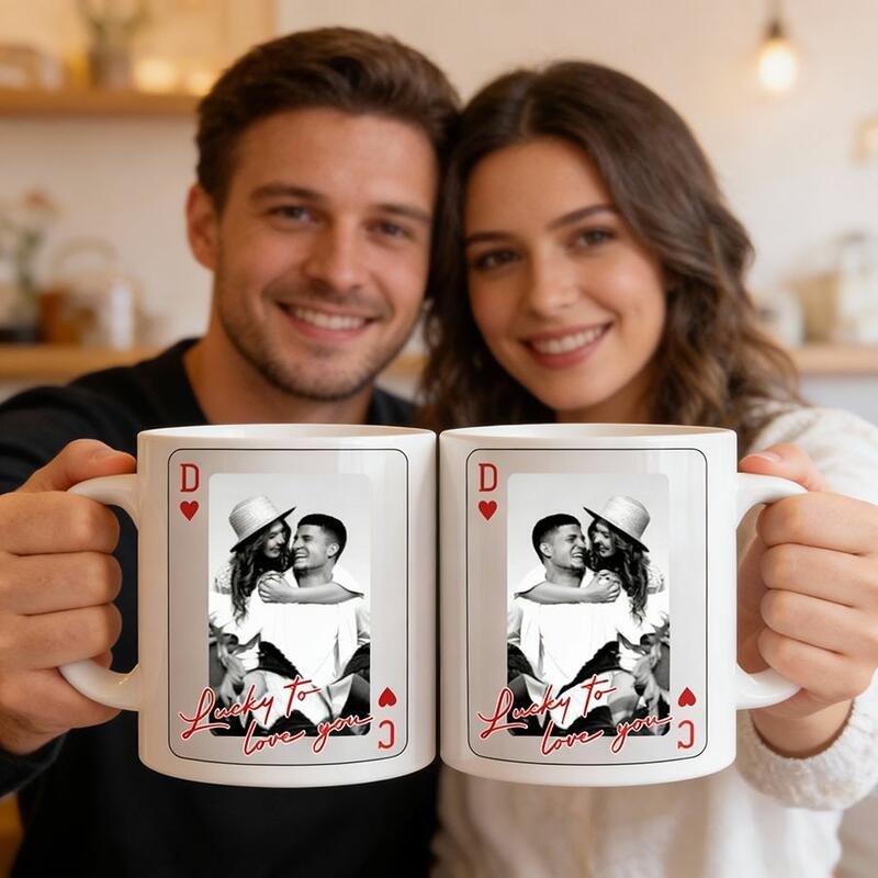 Tasse personnalisée avec photo et motif style carte à jouer cadeau unique pour les couples